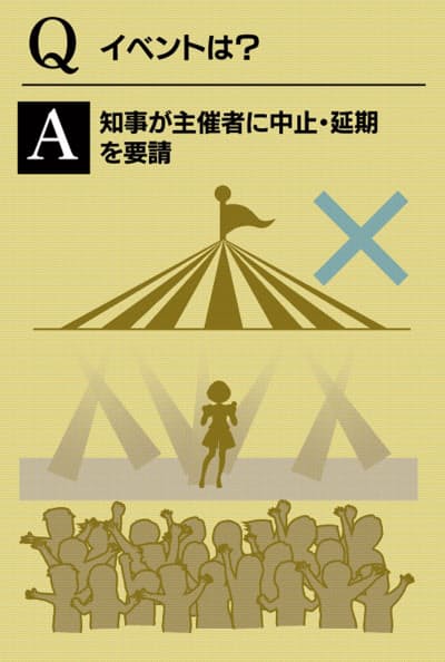安倍晋三首相は2月に大規模イベントの自粛を要請した。緊急事態宣言が出た後は自粛要請に法的な裏付けが生まれる。イベントを開いても罰則はないが、知事が使用制限を要請・指示した施設の名前は公表される。