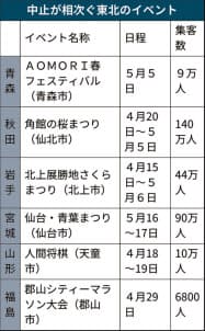 新型コロナウイルスの感染拡大を受け、東北の観光地ではゴールデンウイーク(GW)期間前後に予定されている祭りなどのイベントが相次いで中止になった。宿泊施設の予約キャンセルも止まらず、観光業界への打撃は大きい。GWから初夏にかけてのイベントは夏祭りに向けた前哨戦とされており、先行きが見通せない状況に関係者からは不安の声が漏れる。