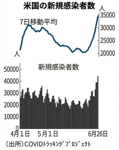 検査状況をまとめる「COVIDトラッキングプロジェクト」によると、米東部時間26日午後6時(日本時間27日午前7時)時点で26日の米国の新規感染者数は約4万4千人と過去最多になった。テキサスやフロリダ州などで増加が目立つ。
