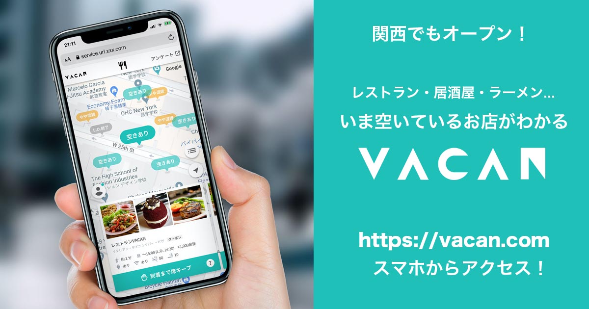 2020年6月15日、株式会社バカンは、近隣飲食店の混雑状況がリアルタイムで分かる自社のWebサービス「VACAN」のエリアを拡大したと発表しました。今回関西エリアが新しく追加となり、これでサービスエリアは九州、関東に続き3つ目となりました。