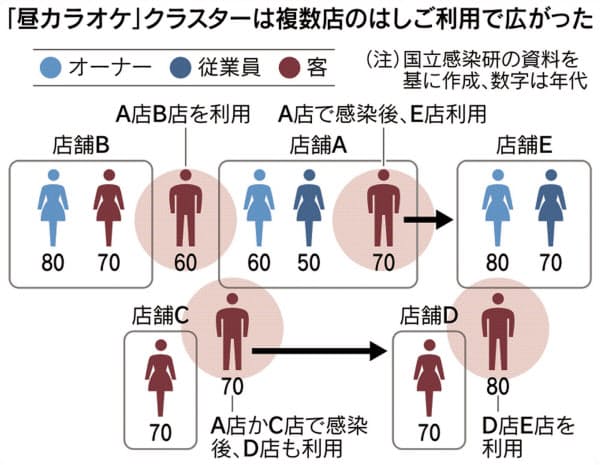 症状が出ていたのにカラオケ店を利用した客もおり、客を介して店から店へ「数珠つなぎ」で感染が拡大したことが判明した。